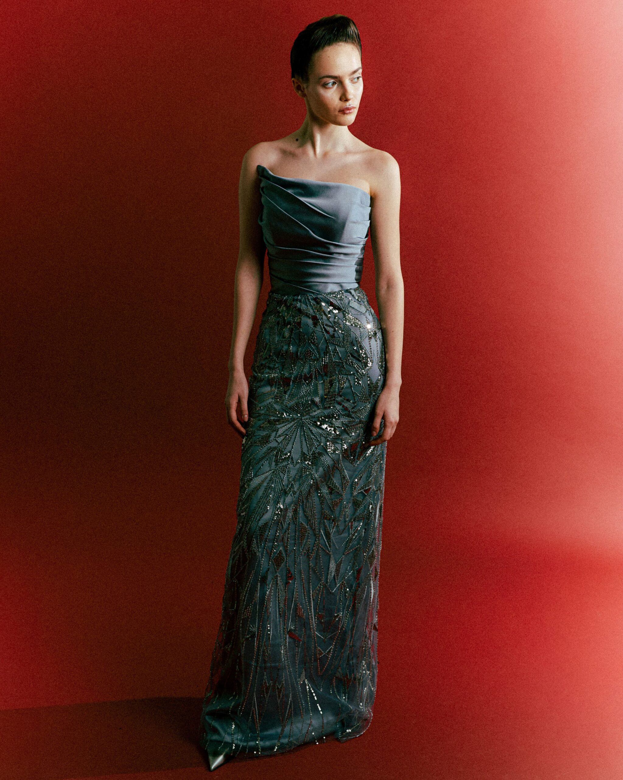 A creation that reflects light, this evening gown was imagined as a masterpiece of modernism, achieved through the futuristic cut of the bodice and the elaborate embroidery of applications that recreate the look of a shattered mirror along the length of the skirt.
