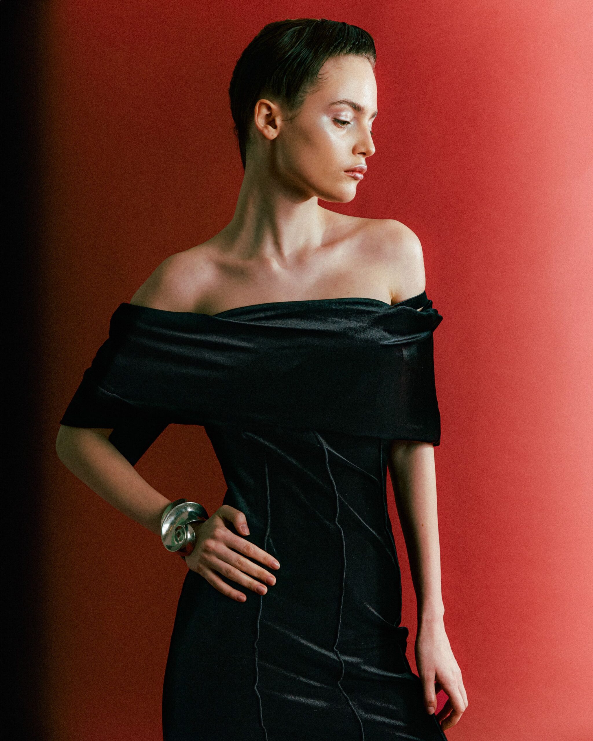 Elegance has been taken to the highest level with Pandora, through a combination of elements of supreme refinement: the cut that faithfully follows the silhouette line, the elastic velvet representing a high-ranking material, and the bust of the dress revealing the shoulders and emphasizing femininity…