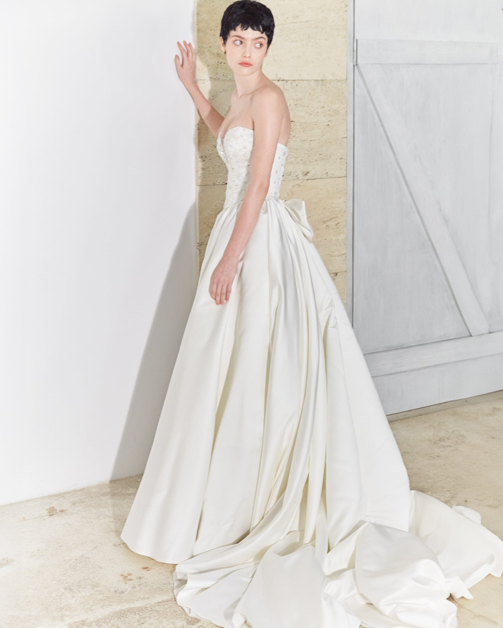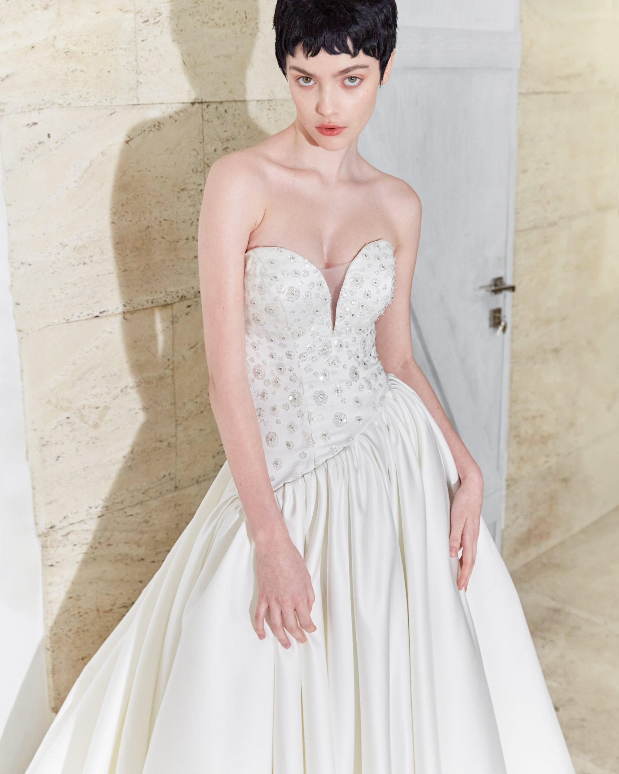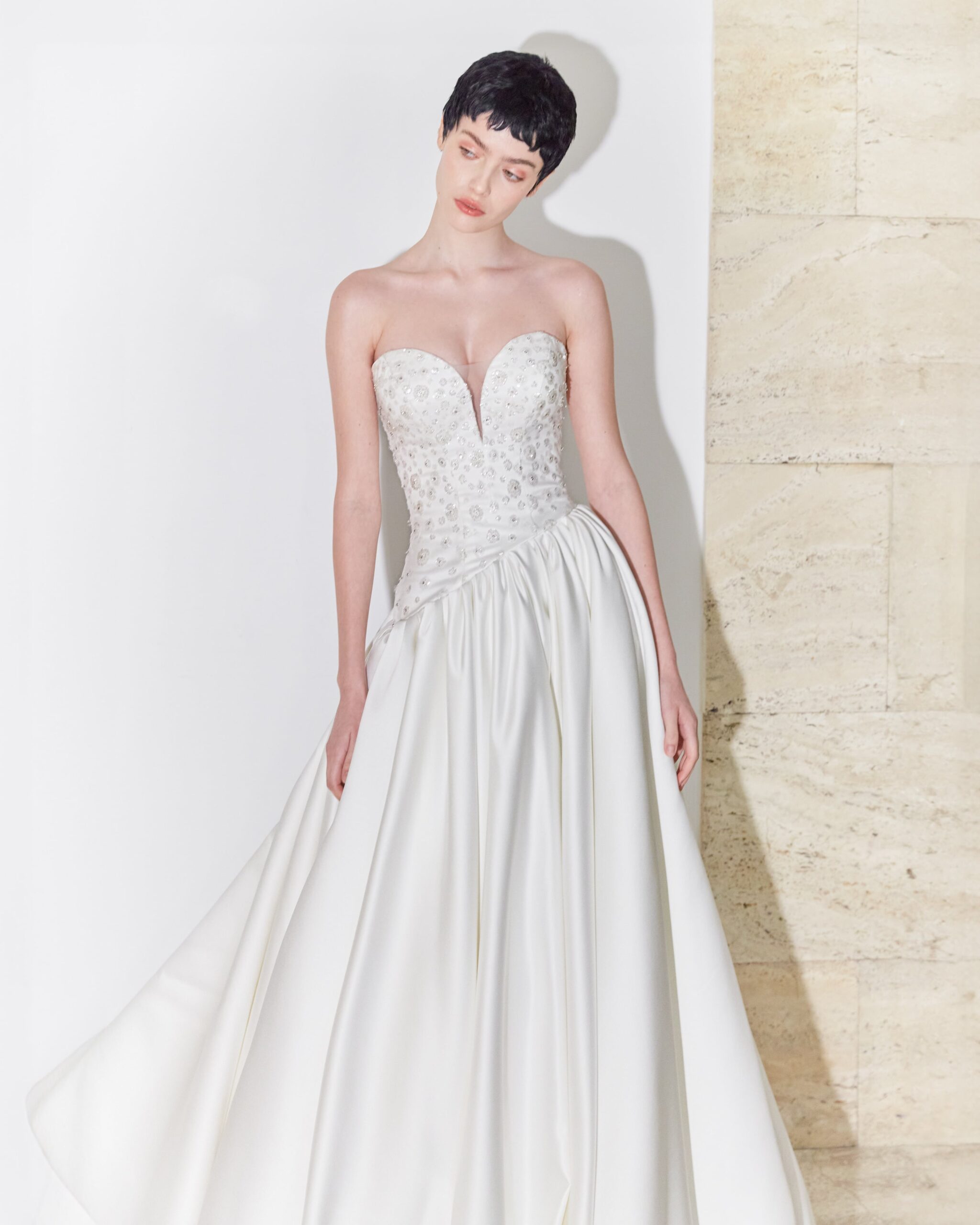 Asymmetrical designs can be extremely sophisticated, especially when accompanied by precious materials and sparkling applications. Say YES to this spectacularly designed wedding dress, which combines creative tailoring with luxurious materials and craftsmanship!