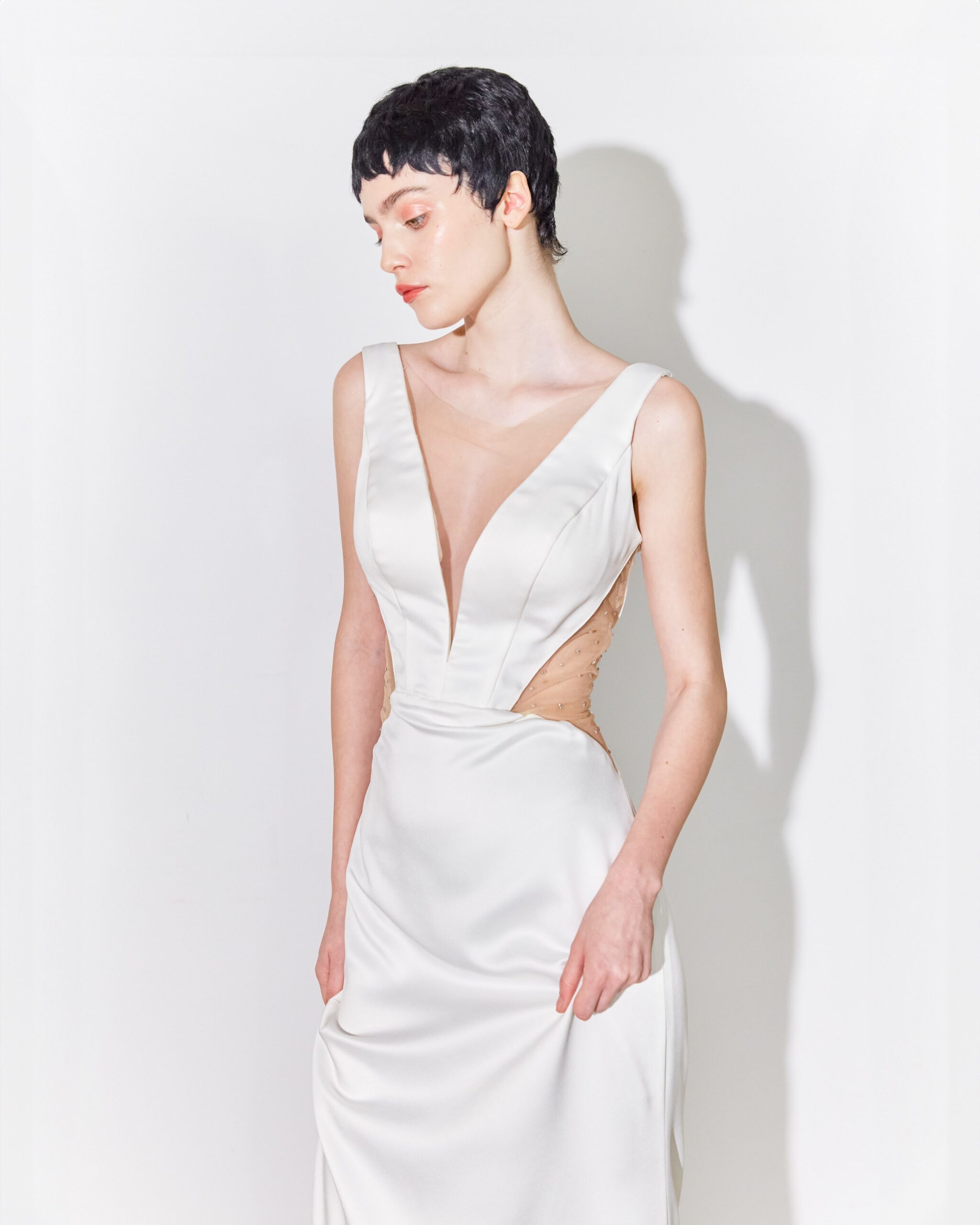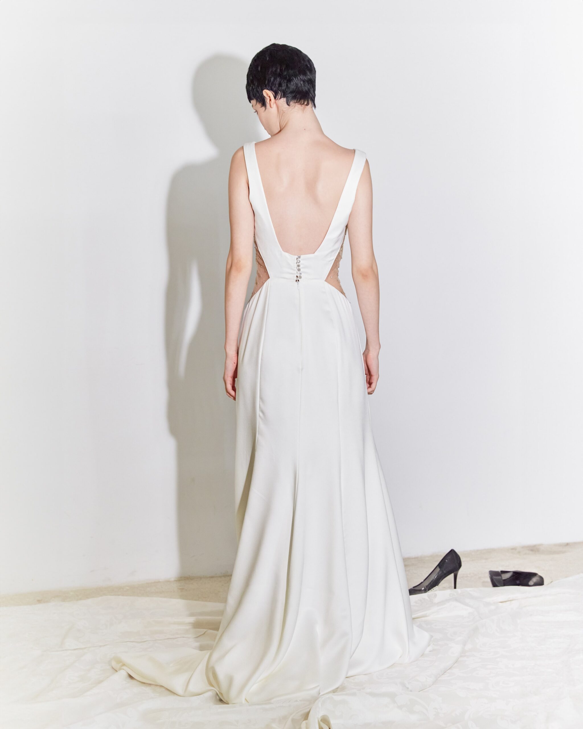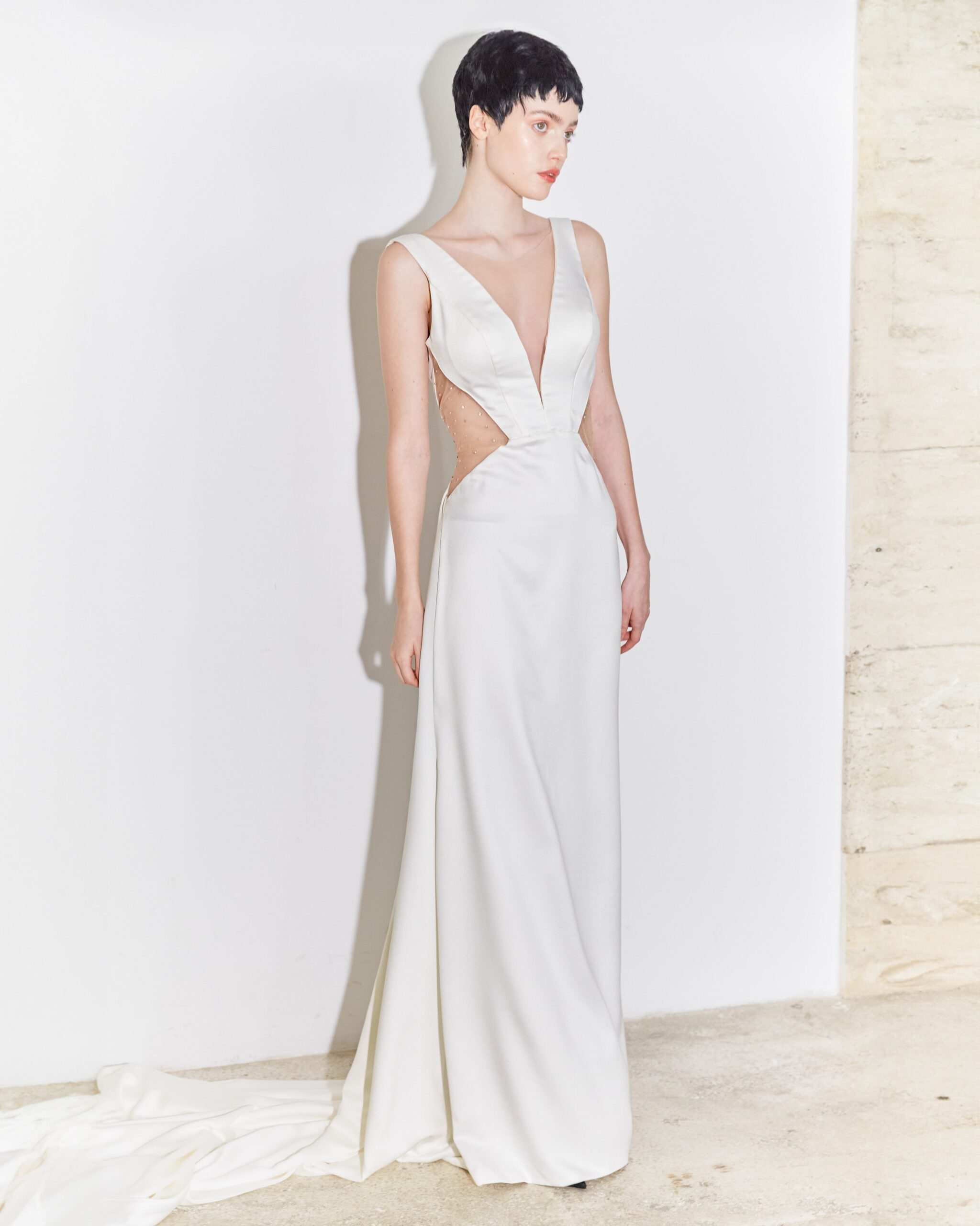 Sensuality is discreetly revealed in a game of strategically placed cutouts, tempered with nude tulle, ennobled with sparkling applications. The Dara wedding dress reveals while covering, it is simple yet sophisticated, and it seduces the audience creating magic through contrasts.