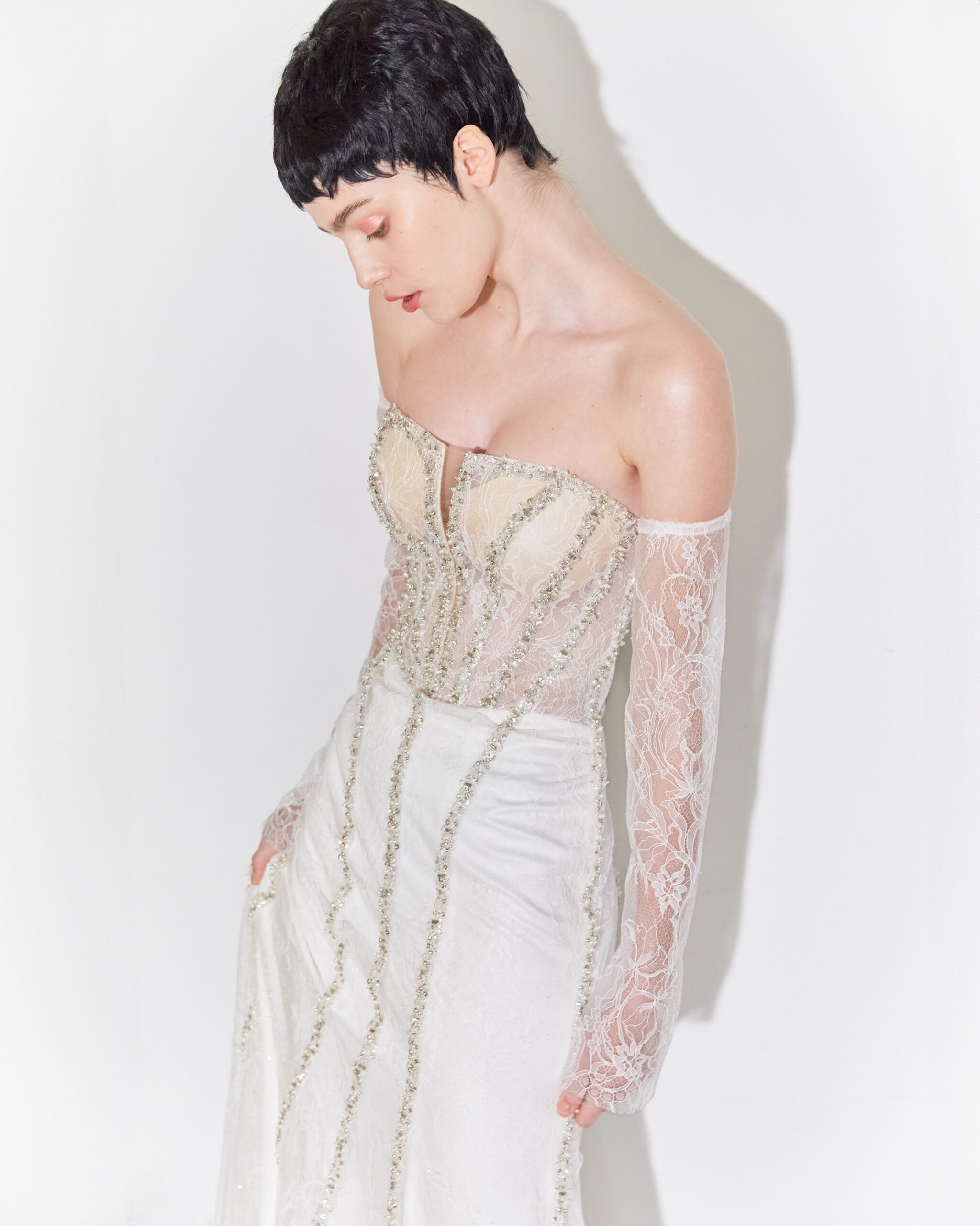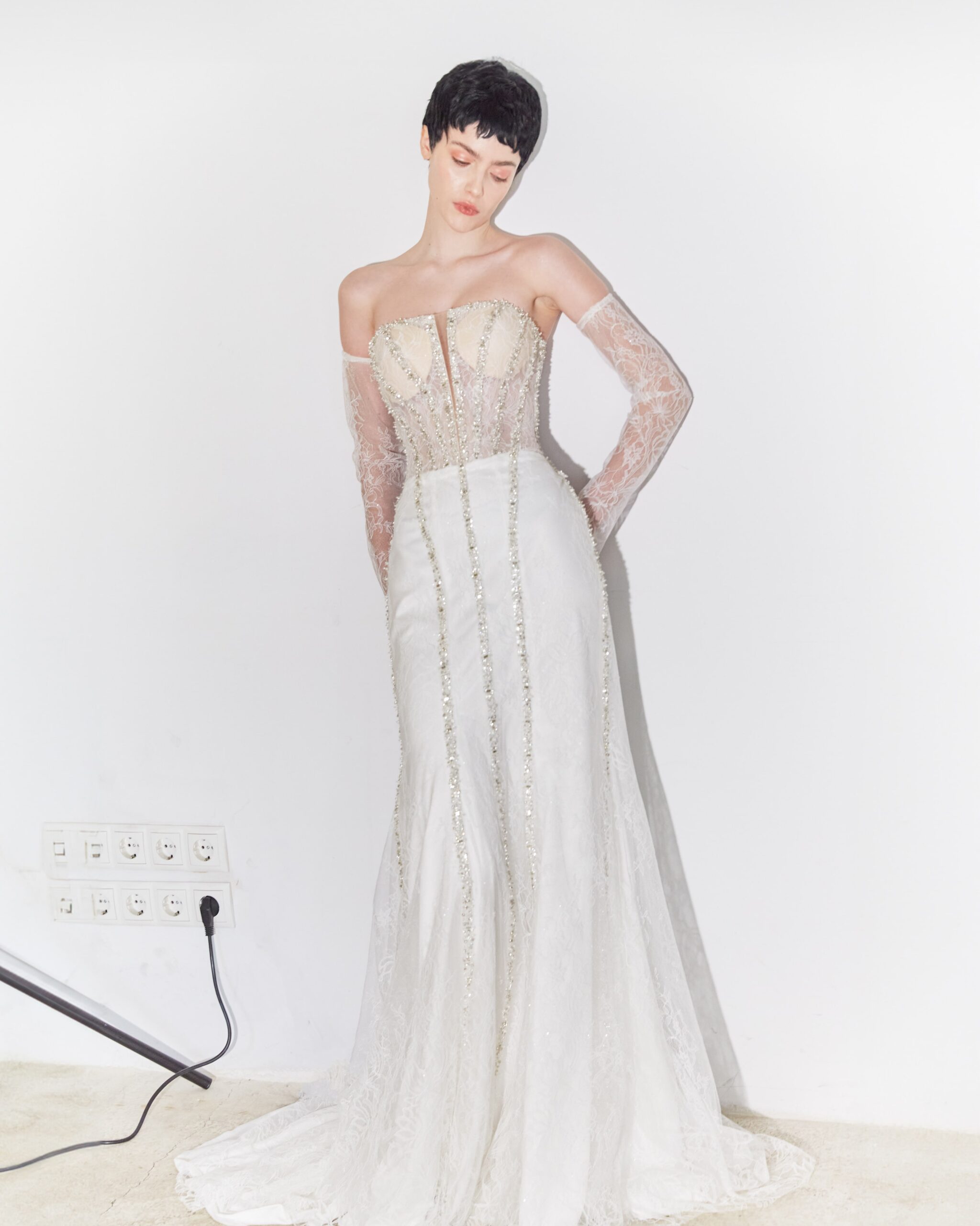 Fine lace with handmade sequin and bead inserts! What could be more precious than that? The Philippa wedding dress impresses with the sensuality of the cut, the creativity of the design, and the meticulousness of the details. A creation that deserves all attention!