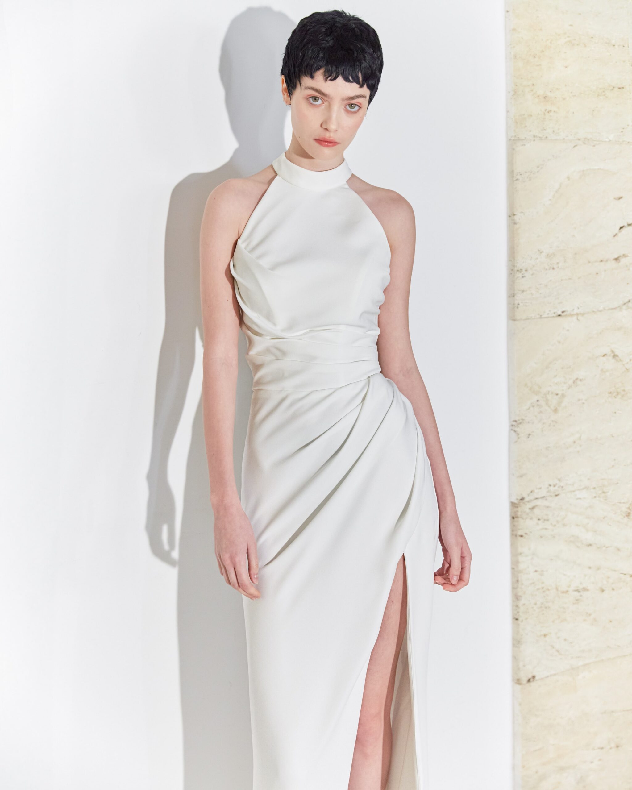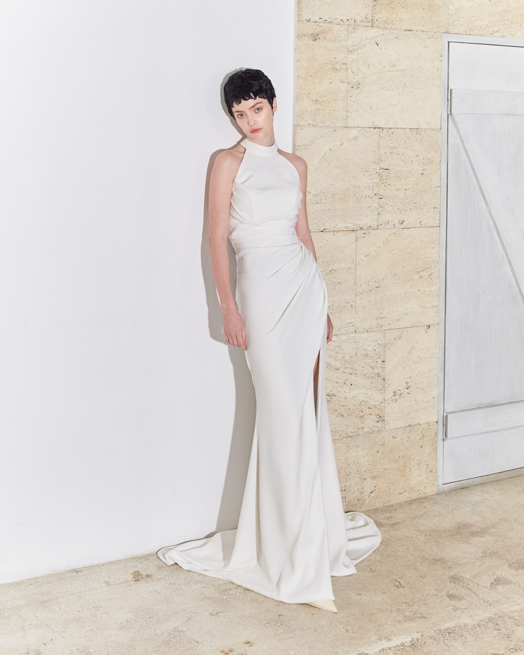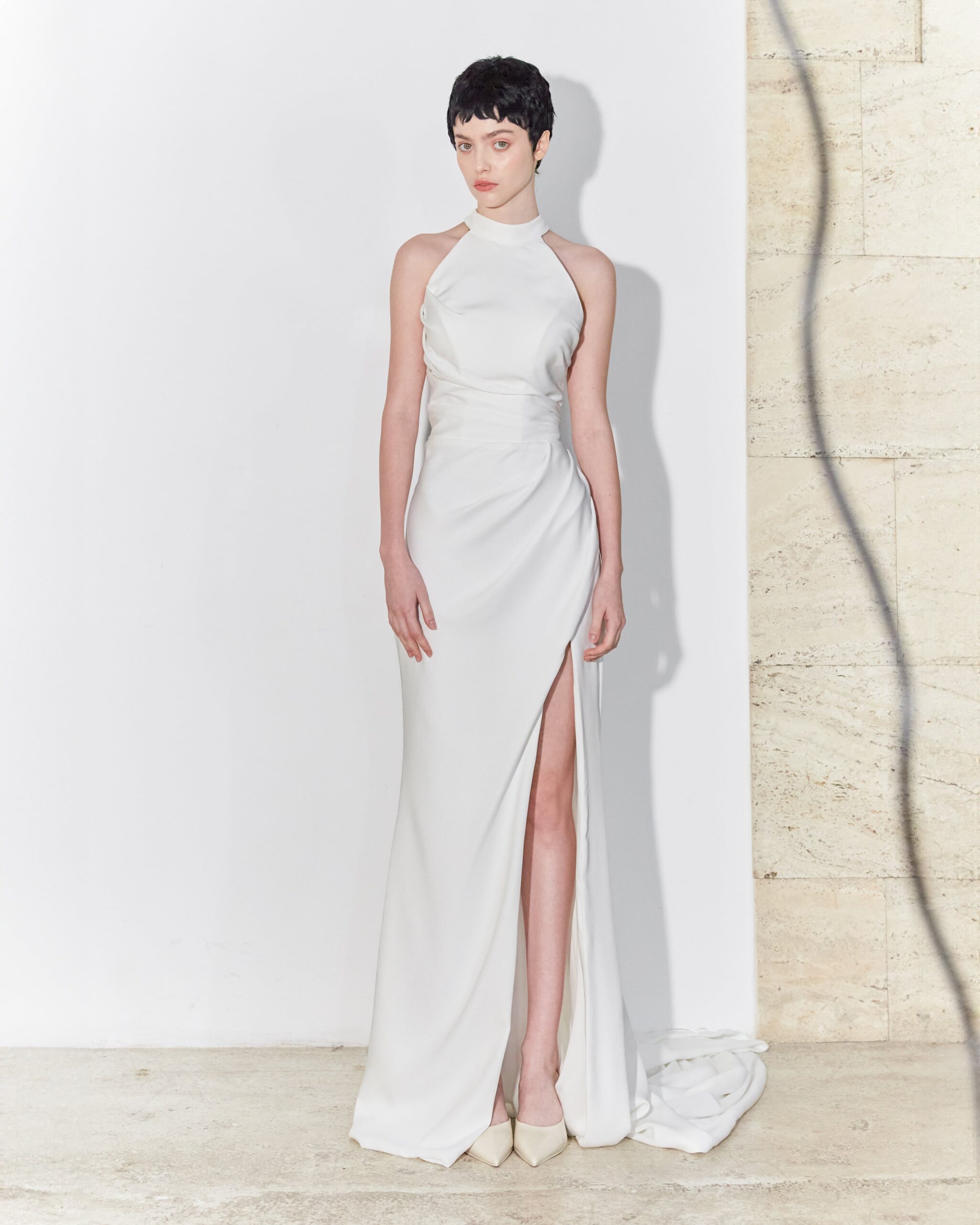 When simplicity met supreme elegance, this divine creation took shape. Made of pure silk, which maintains its fluidity and complements the woman’s body, this wedding dress discreetly combines the three attributes of absolute femininity: purity, elegance, and sensuality.