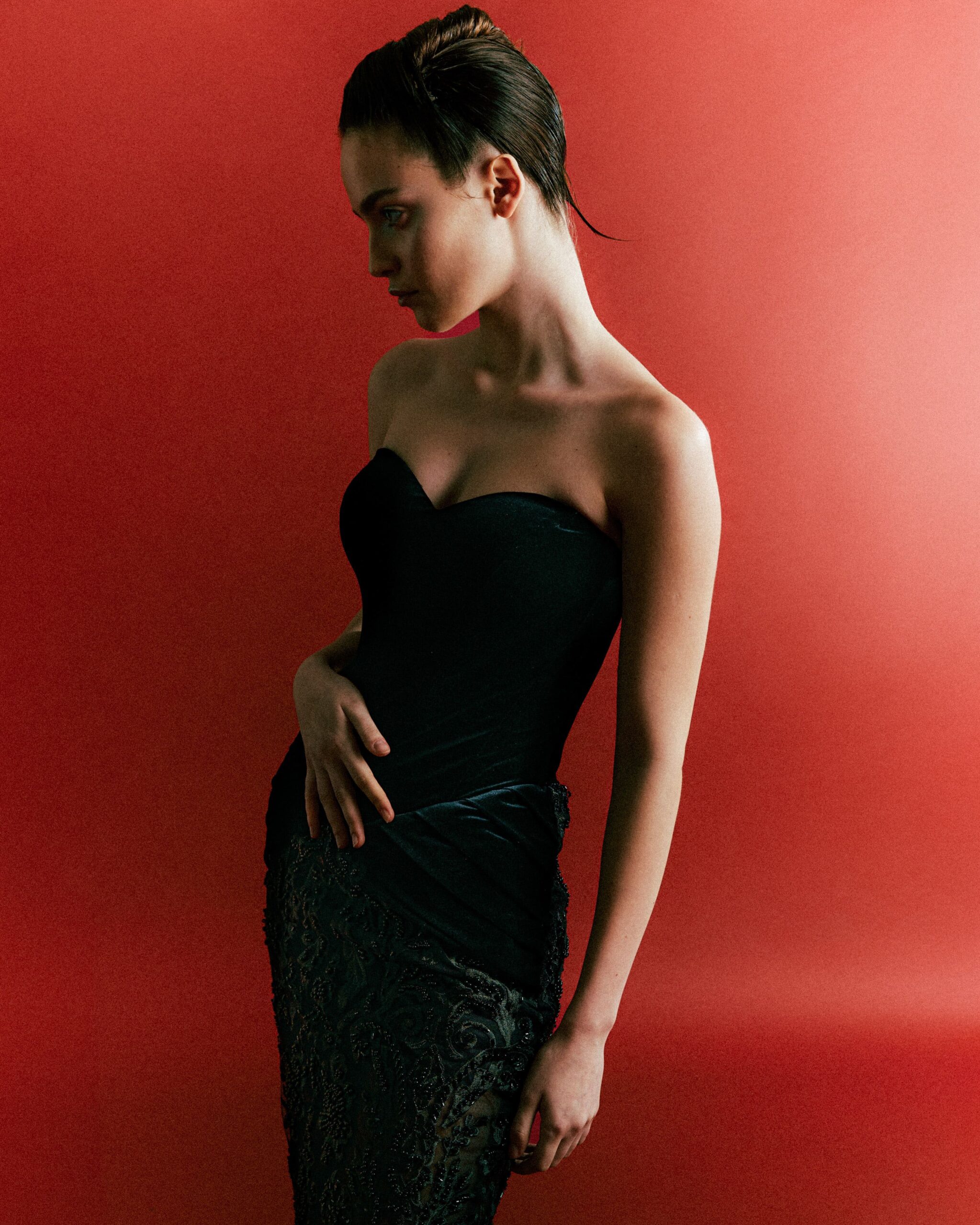 Cine poate contesta rafinamentul acestei rochii realizate din materiale nobile? Catifeaua neagră ce întruchipează eleganța absolută și broderia complicată, din paiete și mărgele, cusute manual, alcătuiesc o ecuație de stil de mare valoare.